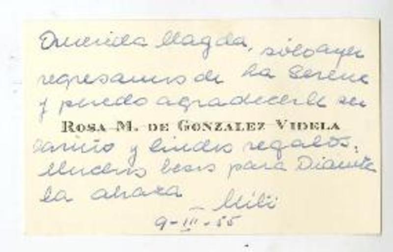 Santiago, Chile [a] Magda Arce Tarjeta, cerca de 1954, [manuscrito] Gabriel González Videla y Rosa Markmann.