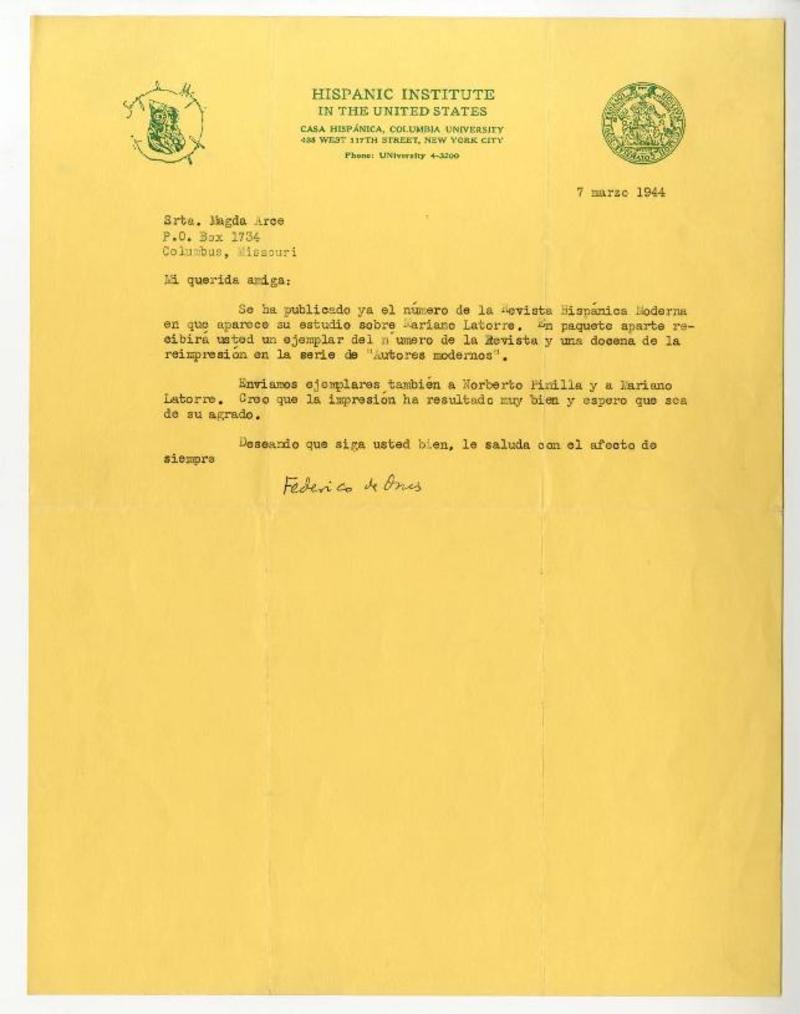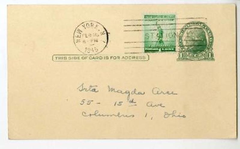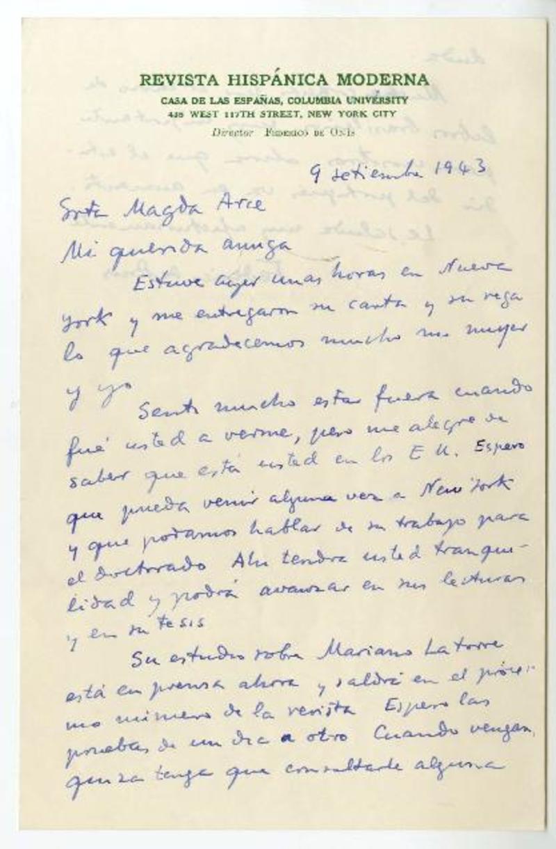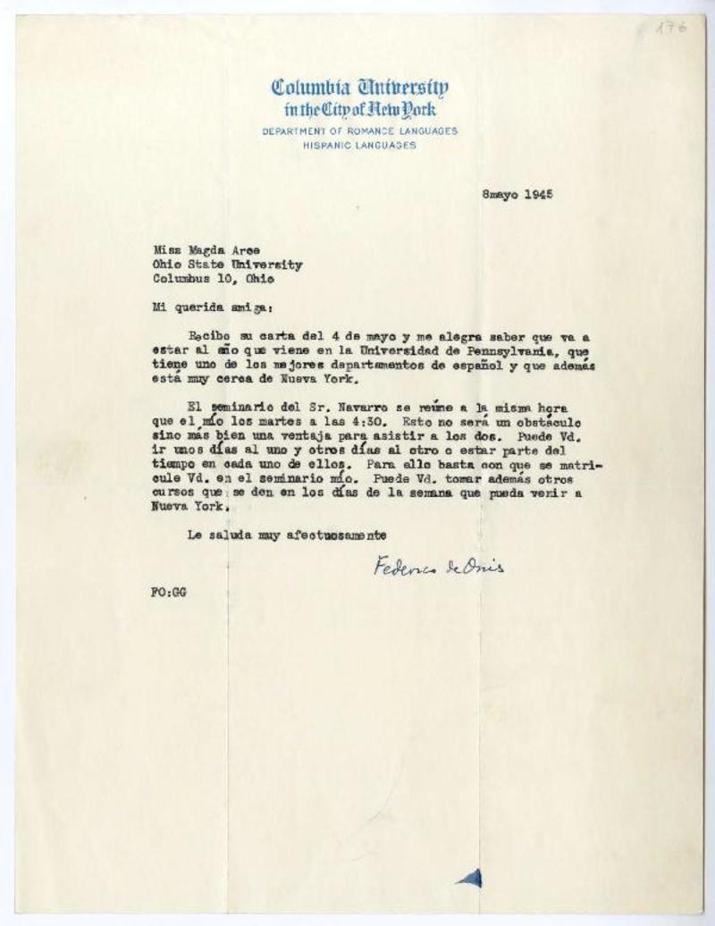 Columbia University, New York [a] Magda Arce, Ohio Tarjeta, 1945 febrero 16, [manuscrito] Federico de Onís.