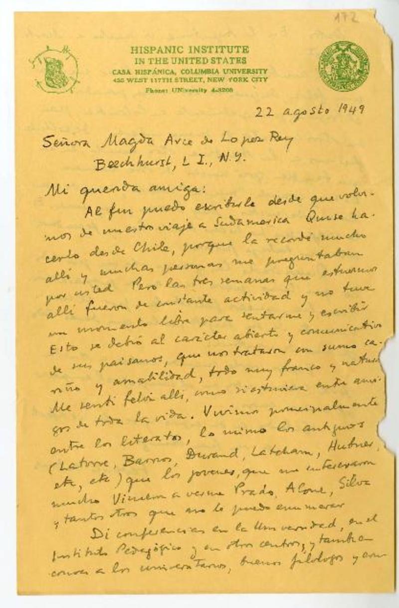 Santiago, Chile [a] Magda Arce, Nueva York Carta, 1947 , [manuscrito] Mariano Latorre.