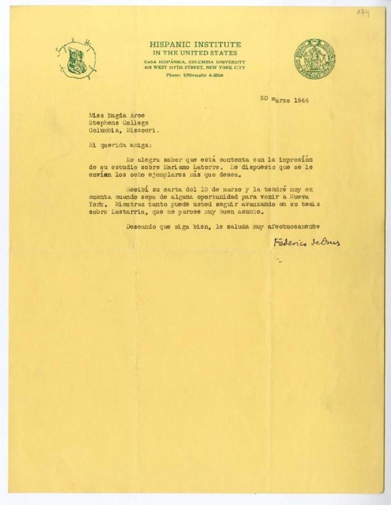 Washington, D.C. [a] Magda Arce, Stephens College, Columbia Carta, 1944 marzo 24, [manuscrito] Concha Romero James.