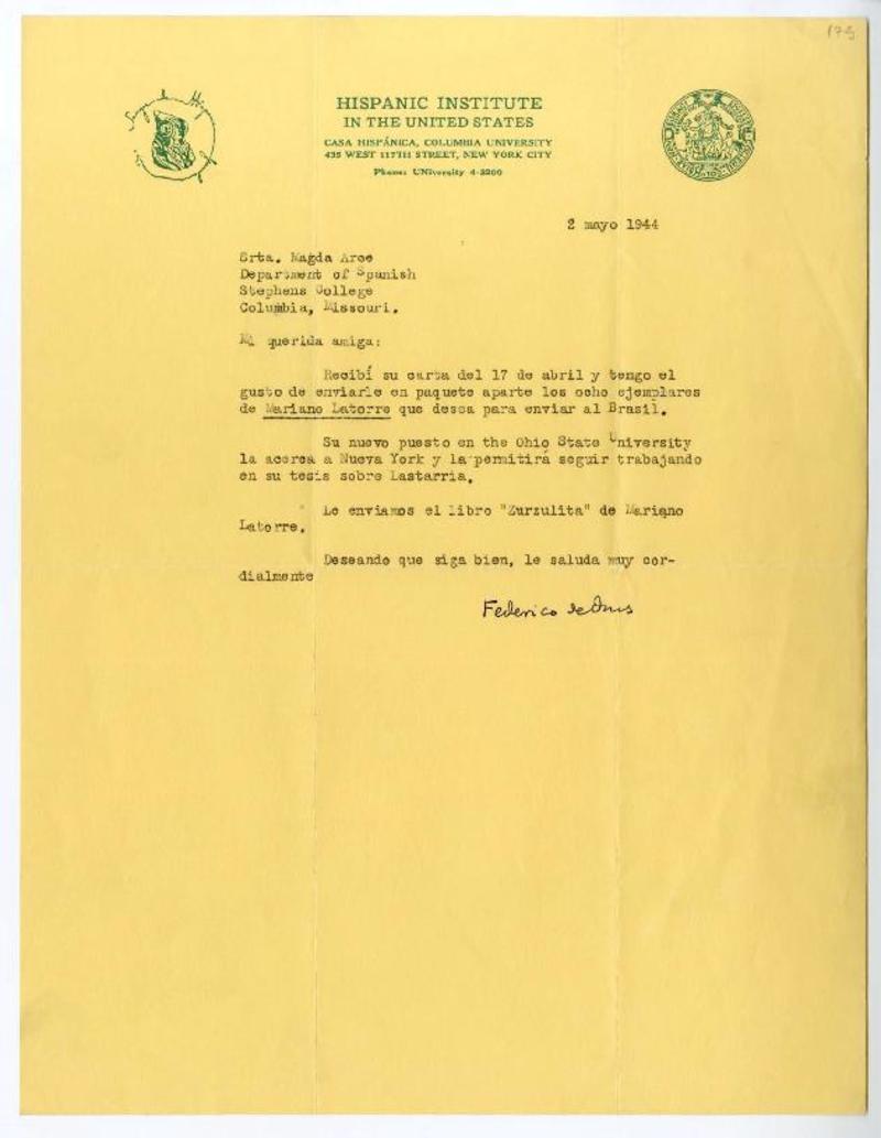 Washington D.C. [a] Magda Arce. Carta, 1944 mayo 19, [manuscrito] Lewis Hanke.