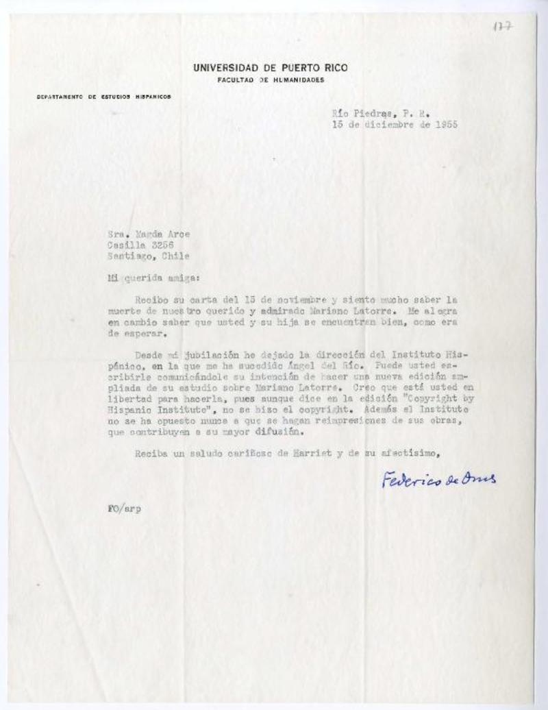 Río Piedras, Puerto Rico [a] Magda Arce, Santiago, Chile Carta, 1955 diciembre 15, [manuscrito] Federico de Onís.