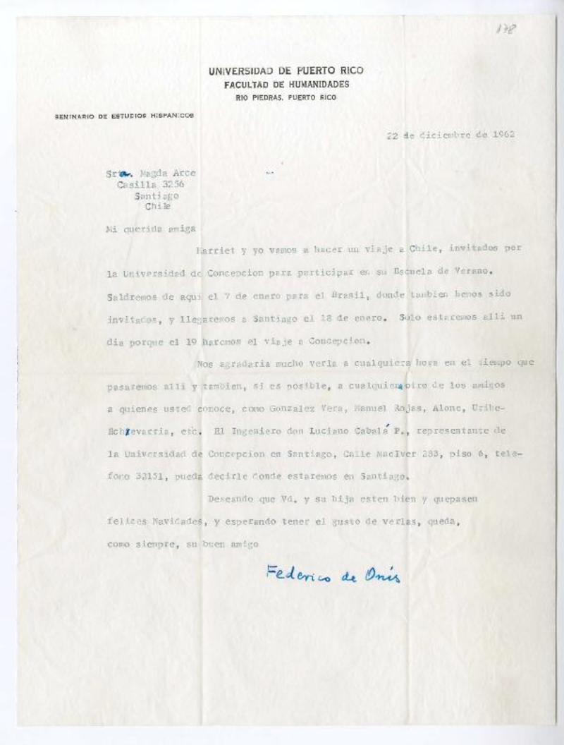 Río Piedras, Puerto Rico [a] Magda Arce, Santiago, Chile Carta, 1962 diciembre 22, [manuscrito] Federico de Onís.