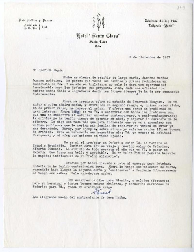 Hotel Santa Clara, Cuba [a] Magda Arce Carta, 1957 diciembre 3, [manuscrito] Harriet De Onís.