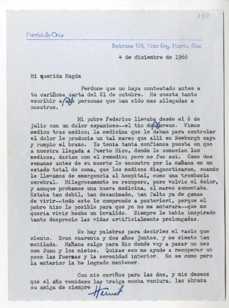 Hato Rey, Puerto Rico [a] Magda Arce carta, 1966 diciembre 04, [manuscrito] Harriet de Onís.