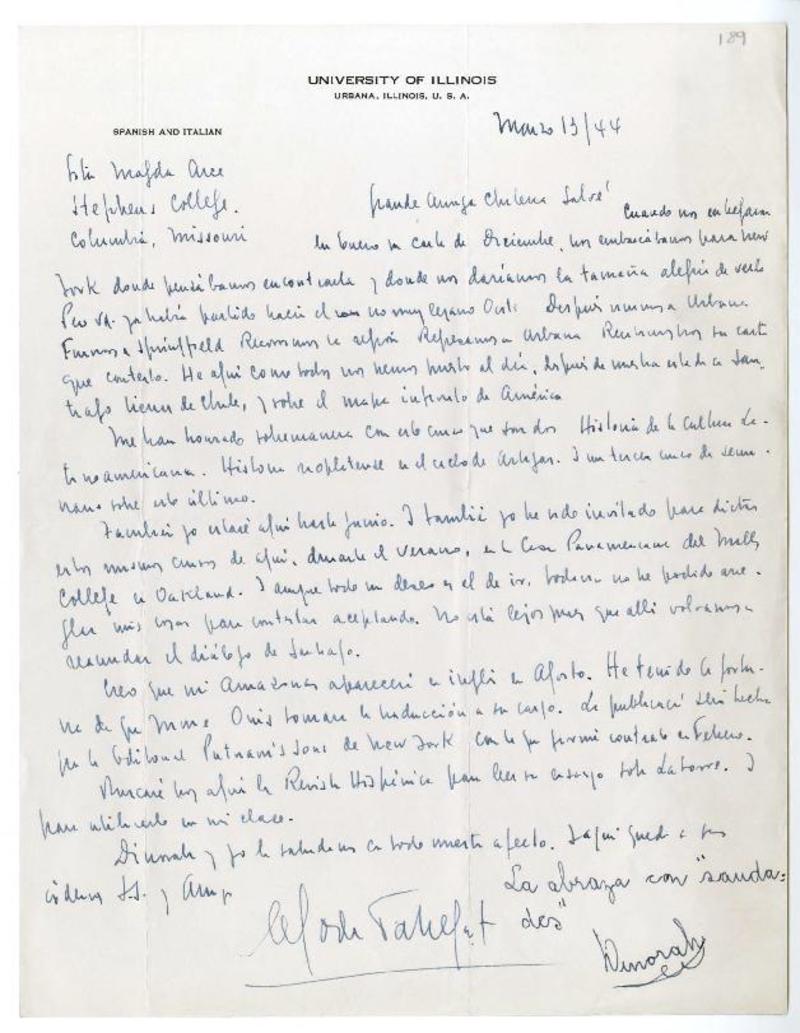 Illinois [a] Magda Arce, Stephens College, Columbia, Missouri Carta, 1944 marzo 13, [manuscrito] Enrique Rodríguez Fabregat