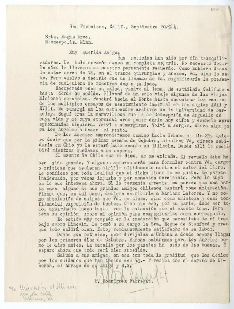 San Francisco, California [a] Magda Arce, Minneapolis Carta, 1944 septiembre 20, [manuscrito] Enrique Rodriguez Fabregat.
