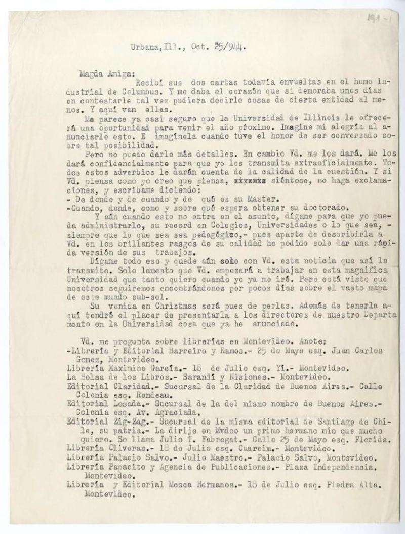 Urbana, Illinois [a] Magda Arce carta, 1944 octubre 25, [manuscrito] Enrique Rodrígue Fabregat