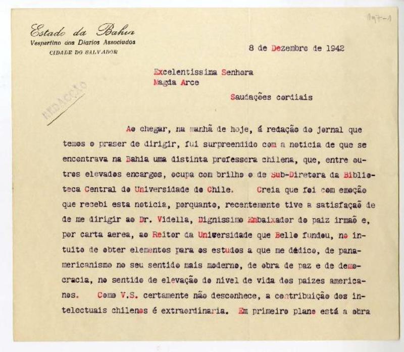Salvador de Bahia, Brasil [a] Magda Arce Carta, 1942 diciembre 8, [manuscrito] Evaldo Simas Pereira.