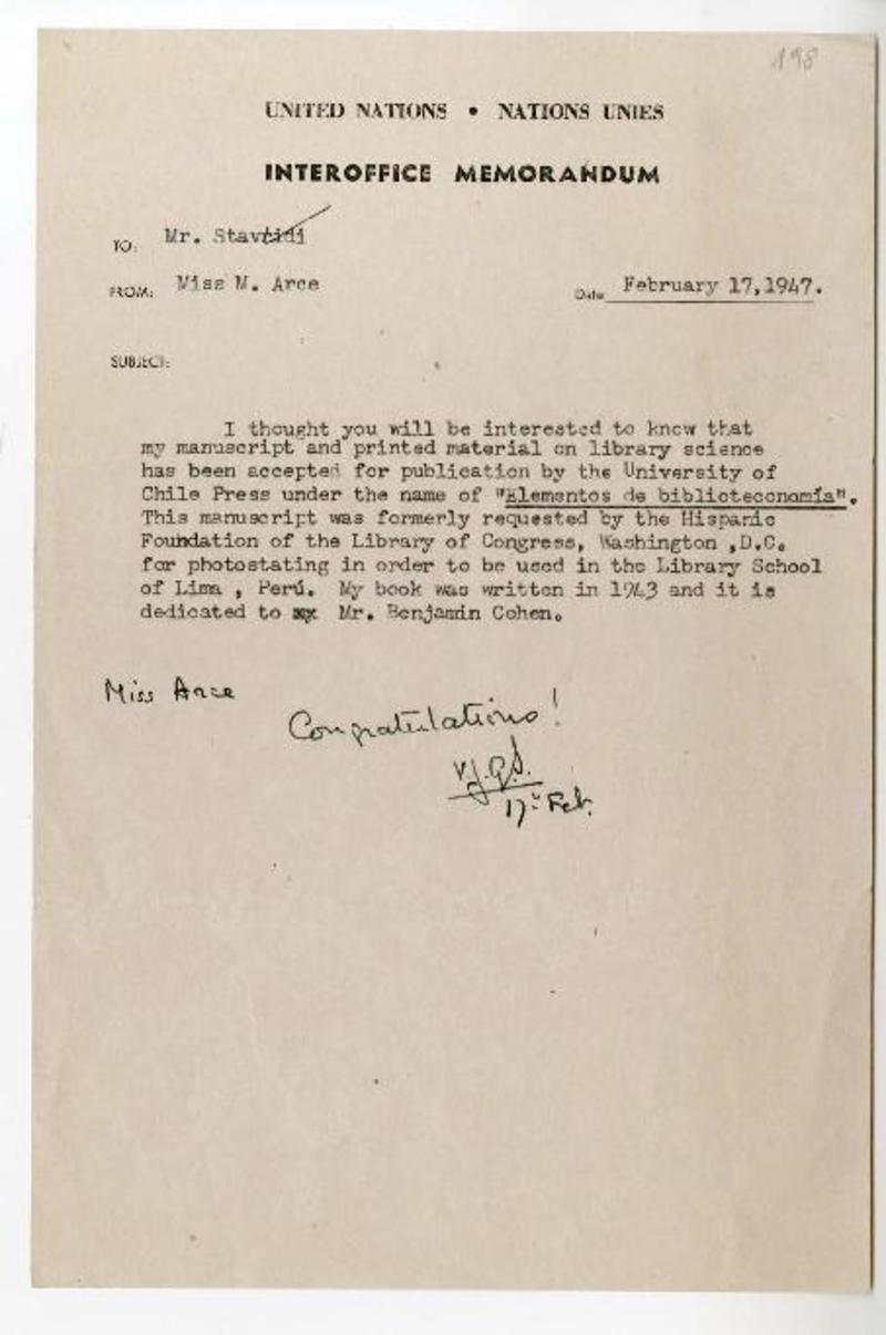 United Nations, Estados Unidos [a] Mr. Stavridi Carta, 1947 febrero 17, [manuscrito] Magda Arce.