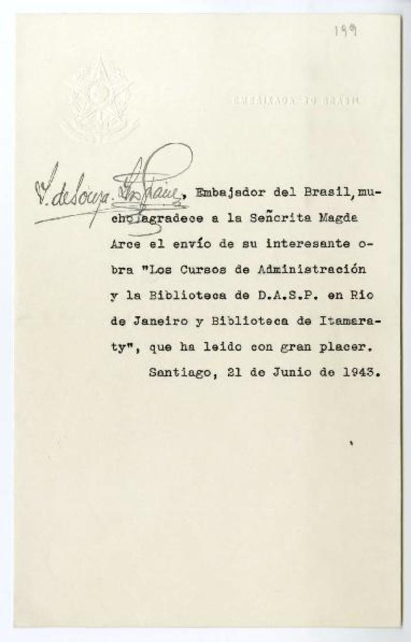 Santiago, Chile [a] Magda Arce Carta, 1943 junio 21, [manuscrito] Samuel de Souza-Leao Gracie.