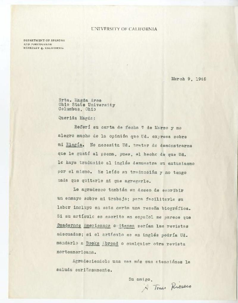 University of California, Department of Spanish and Portuguese, California [a] Magda Arce, Ohio State University, Columbus, Ohio Carta, 1945 marzo 09, [manuscrito] Arturo Torres Rioseco.