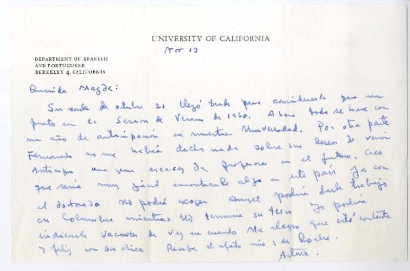 University of California, Department of Spanish and Portuguese, California[a] Magda Arce, Santiago, Chile. Carta, 1959 noviembre 13, [manuscrito] Arturo Torres Rioseco.