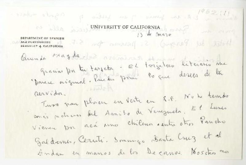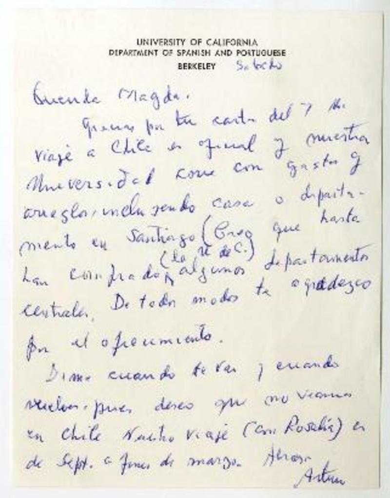 University of California, Department of Spanish and Portuguese, California [a] Magda Arce Carta, 1962 mayo 15, [manuscrito] Arturo [Torres Rioseco].