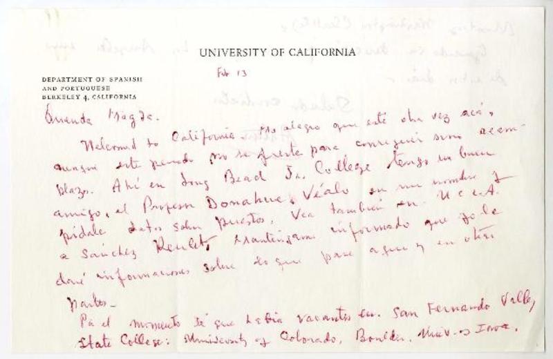 University of California, Department of Spanish and Portuguese, California [a] Magda Arce, California Carta, 1964 febrero 13, [manuscrito] Arturo [Torres Rioseco].