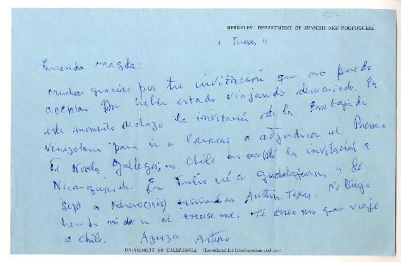 University of California [a] Magda Arce Carta, 1967 jueves 11, [manuscrito] Arturo Torres Rioseco.