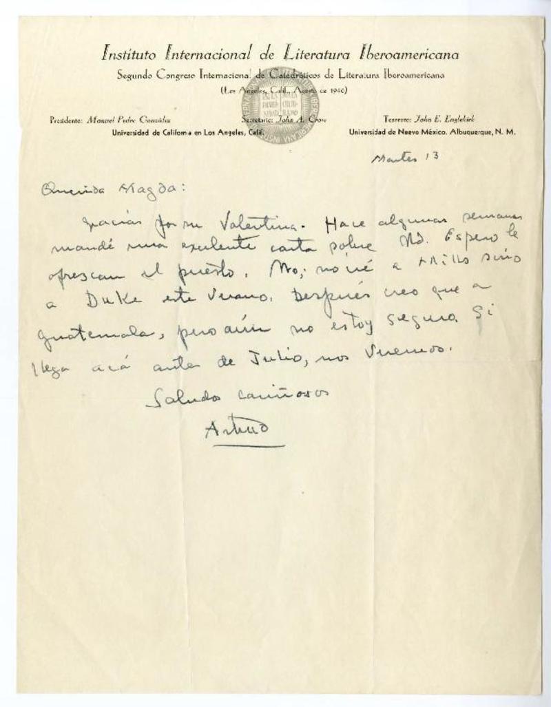Los Angeles, California [a] Magda Arce Carta, 1940 martes 13, [manuscrito] Arturo Torres Rioseco