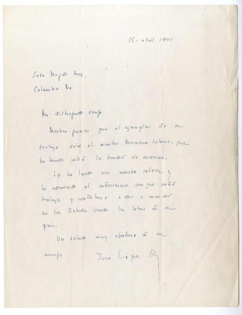 Nueva York [a] Magda Arce, Columbia Carta, 1944 abril 15, [manuscrito] José López-Rey.