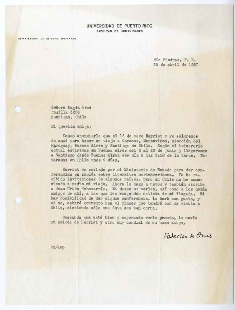 Río Piedras, Puerto Rico [a] Magda Arce, Santiago, Chile Carta, 1957 abril 25, [manuscrito] Federico de Onis.