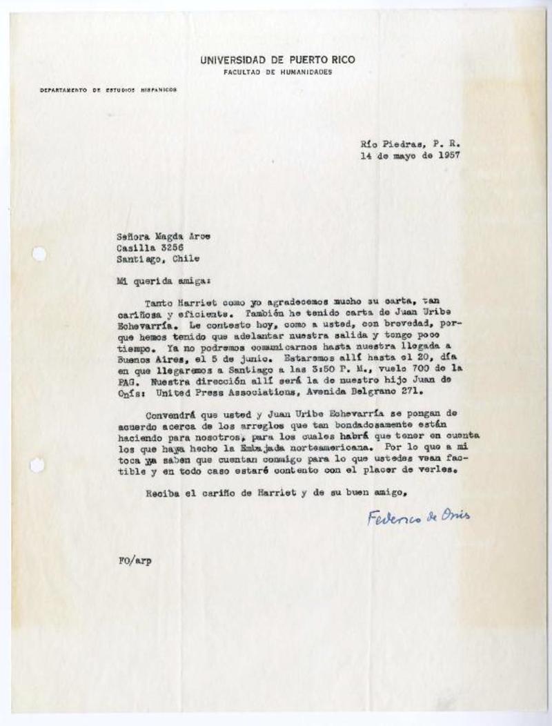 Río Piedras, Puerto Rico [a] Magda Arce, Santiago, Chile Carta, 1957 mayo 14, [manuscrito] Federico de Onís.