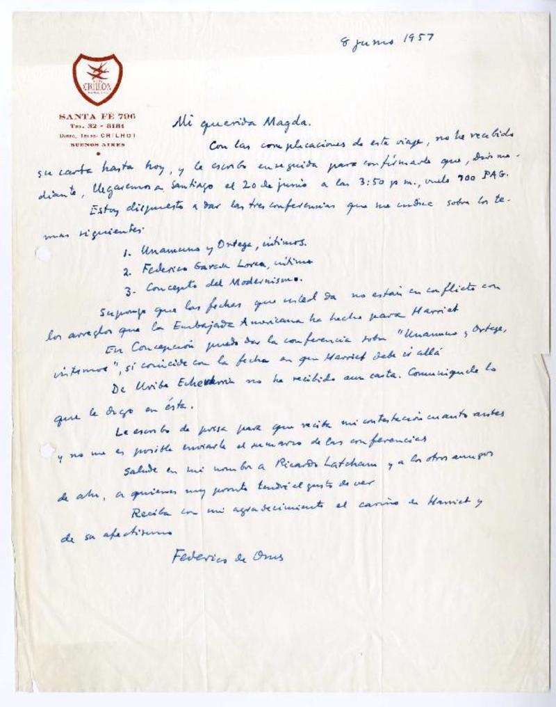 Hotel Crillón, Buenos Aires, Argentina [a] Magda Arce, Santiago, Chile Carta, 1957 junio 8, [manuscrito] Federico de Onís.