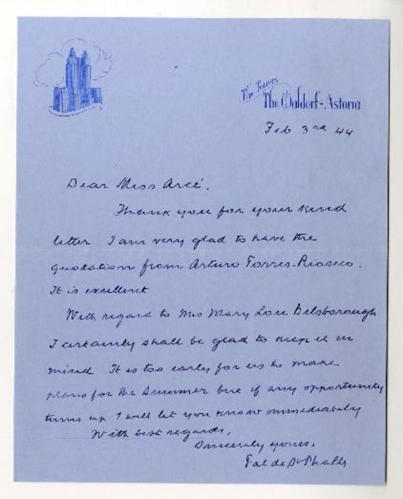 Nueva york [a] Magda Arce Carta, 1944 febrero 3, [manuscrito] Fal de Saint Phalle.