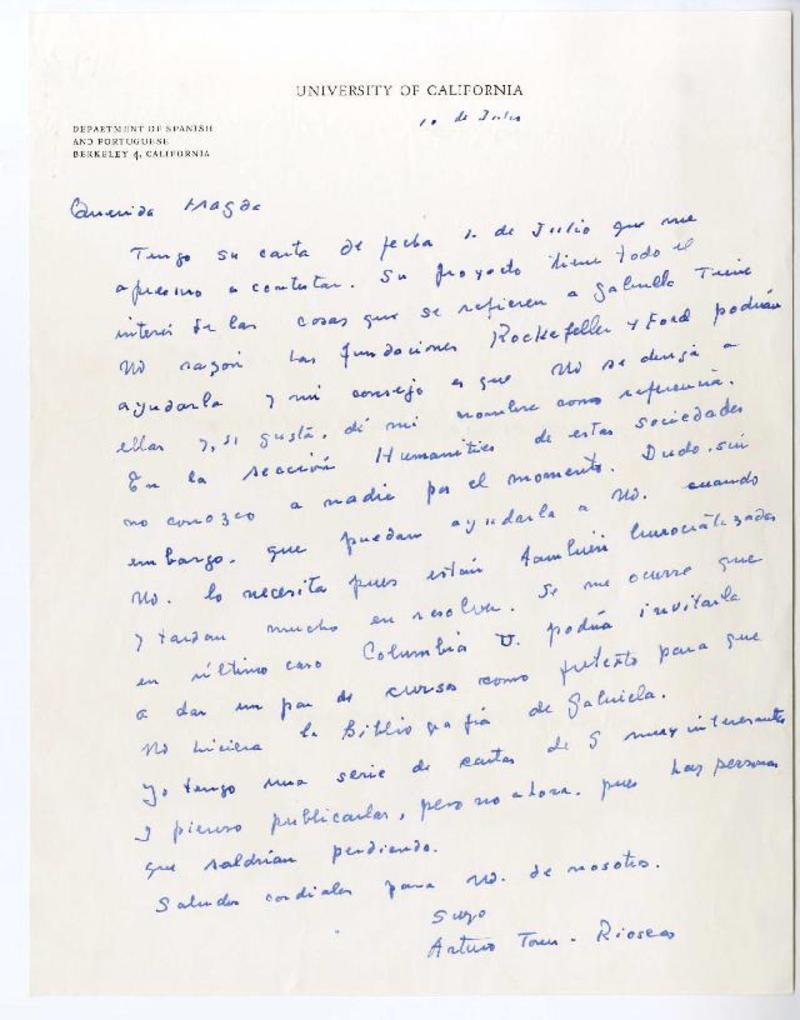 University of California [a] Magda Arce, Santiago, Chile Carta, 1957 julio 10, [manuscrito] Arturo Torres-Rioseco.