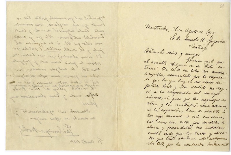 [Carta] 1909 agosto 31, Montevideo, Uruguay [a] Ernesto A. Guzmán [manuscrito] José Enrique Rodó.