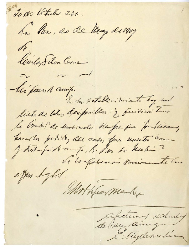[Carta] 1919 mayo 20, La Paz, Bolivia [a] Carlos Silva Cruz [manuscrito] Emilio Rodríguez Mendoza.