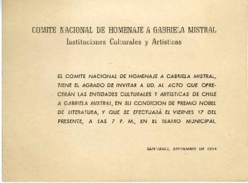 Santiago, Chile, Invitación, 1954 septiembre 17, [manuscrito] Institutos culturales y artísticos.