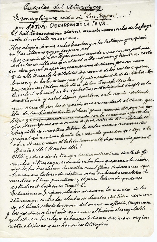 Cuentos del atardecer [manuscrito] Arturo Ossandón de la Peña.