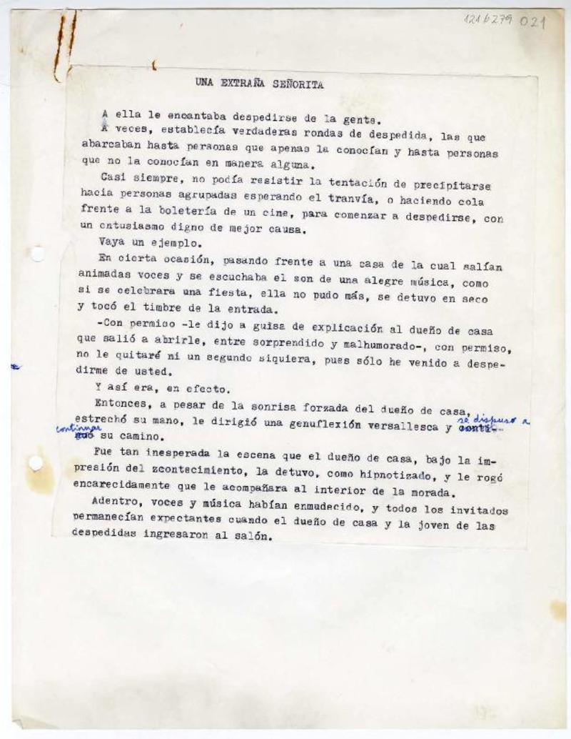 Una extraña señorita [manuscrito] Braulio Arenas.