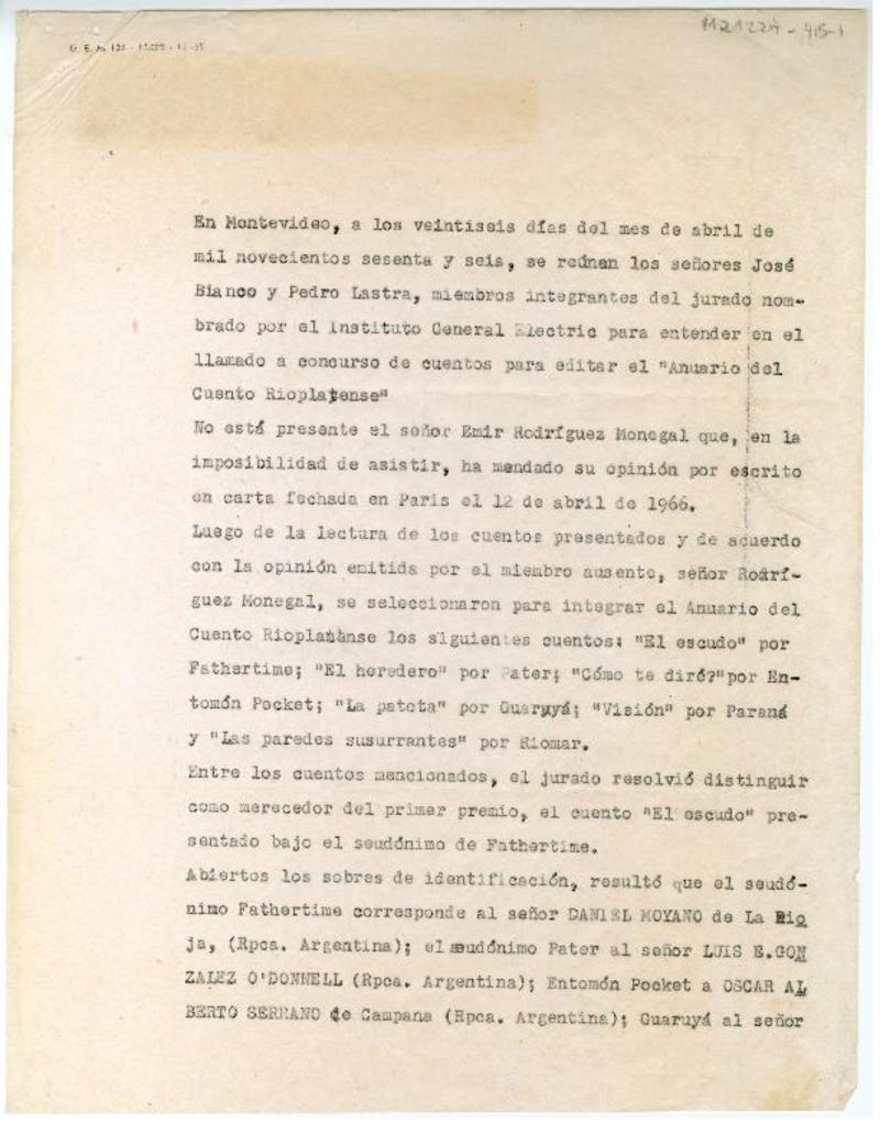 Concurso del cuento Rioplatense [manuscrito] Pedro Lastra y José Bianco.