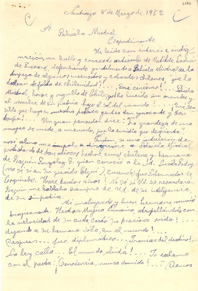 [Carta] 1952 mar. 8, Santiago [a] Gabriela Mistral [manuscrito] Luz Marina González G.