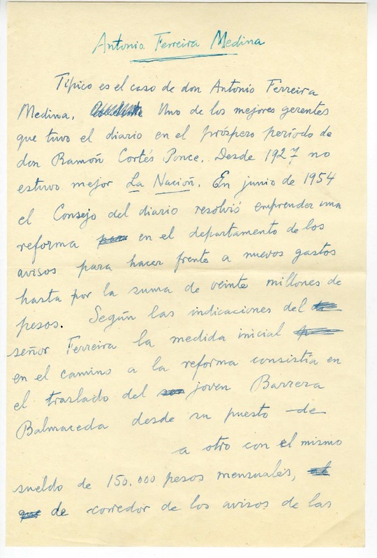 Antonio Ferreira Medina [manuscrito] Joaquín Edwards Bello.