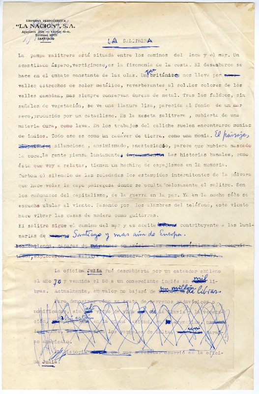 La salitrera [manuscrito] Joaquín Edwards Bello.