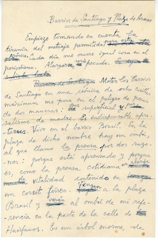 Barrios de Santiago y Plaza de Armas [manuscrito] Joaquín Edwards Bello.