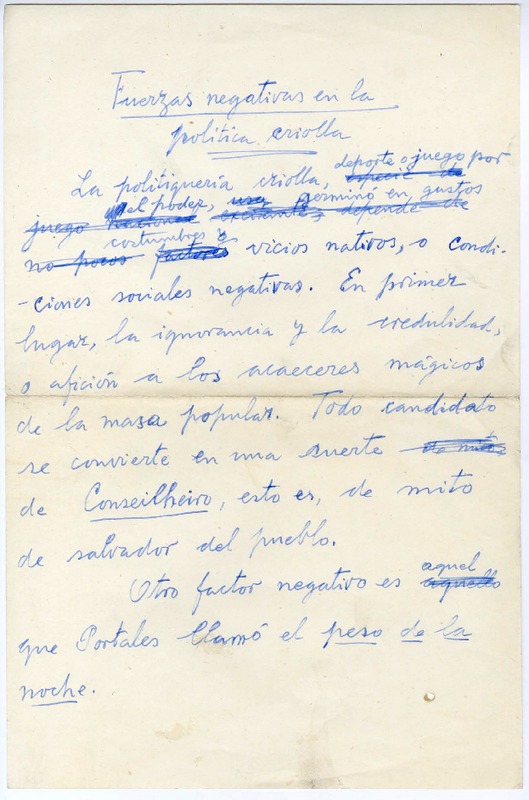 Fuerzas negativas en la política criolla [manuscrito] Joaquín Edwards Bello.