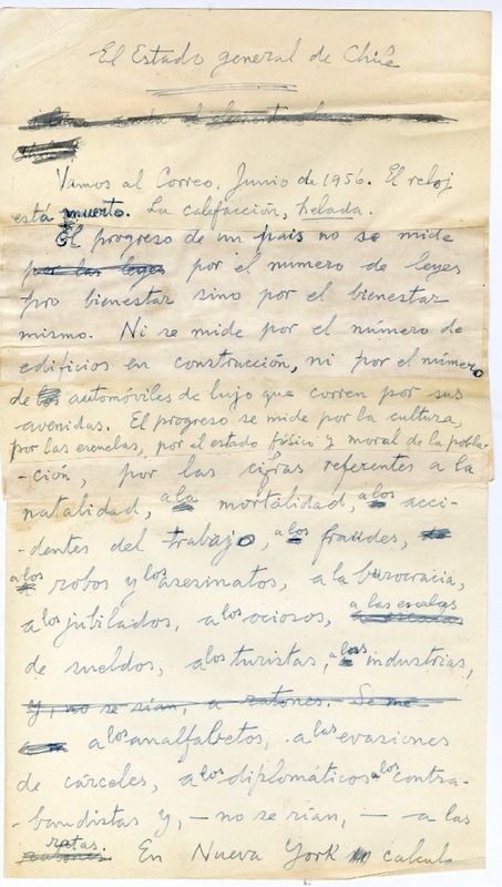 Estado social de Chile y el gobierno de 1956 [manuscrito] Joaquín Edwards Bello.