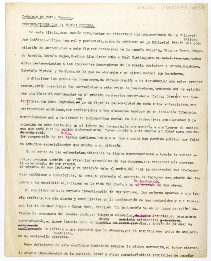 Conversaciones con la poesía chilena [manuscrito] Mario Ferrero.