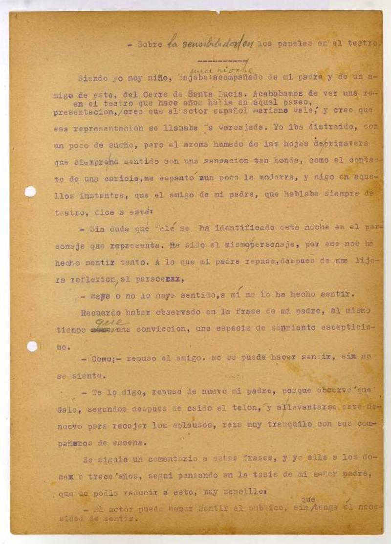 Sobre la sensibilidad en los papeles en el teatro [manuscrito] Nathanael Yáñez Silva.