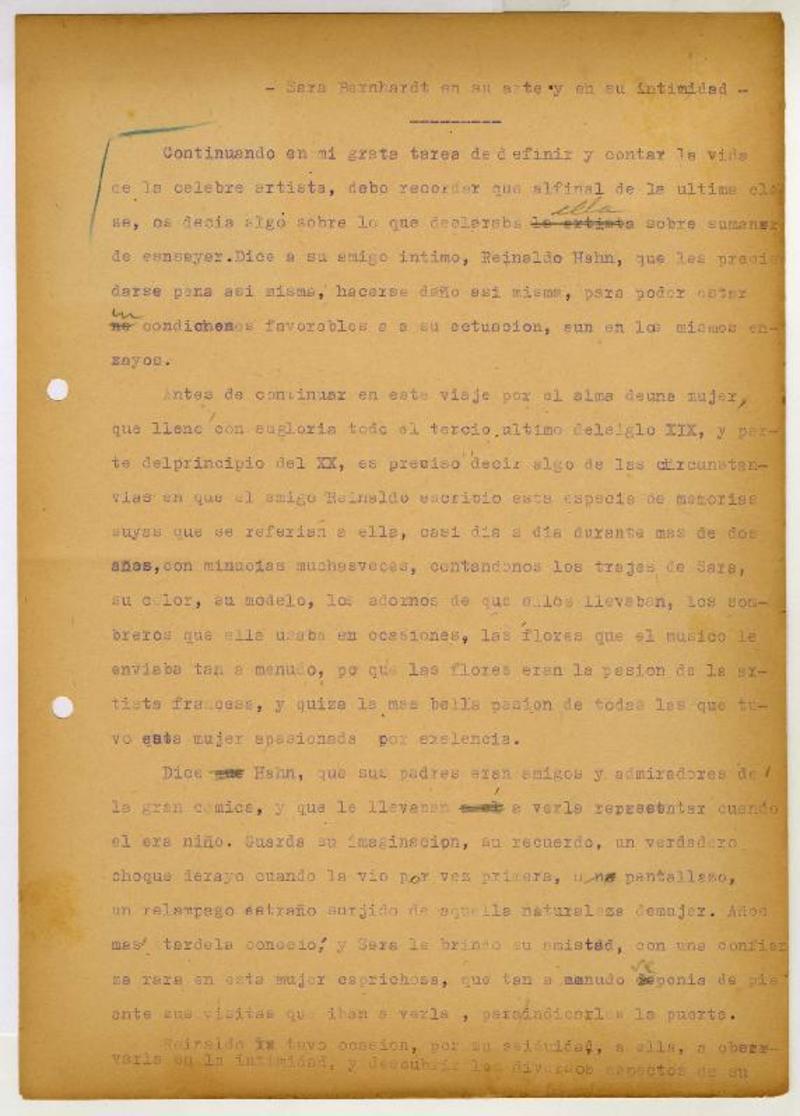 [Vida y arte de Sara Bernhardt] [manuscrito] Nathanael Yáñez Silva.