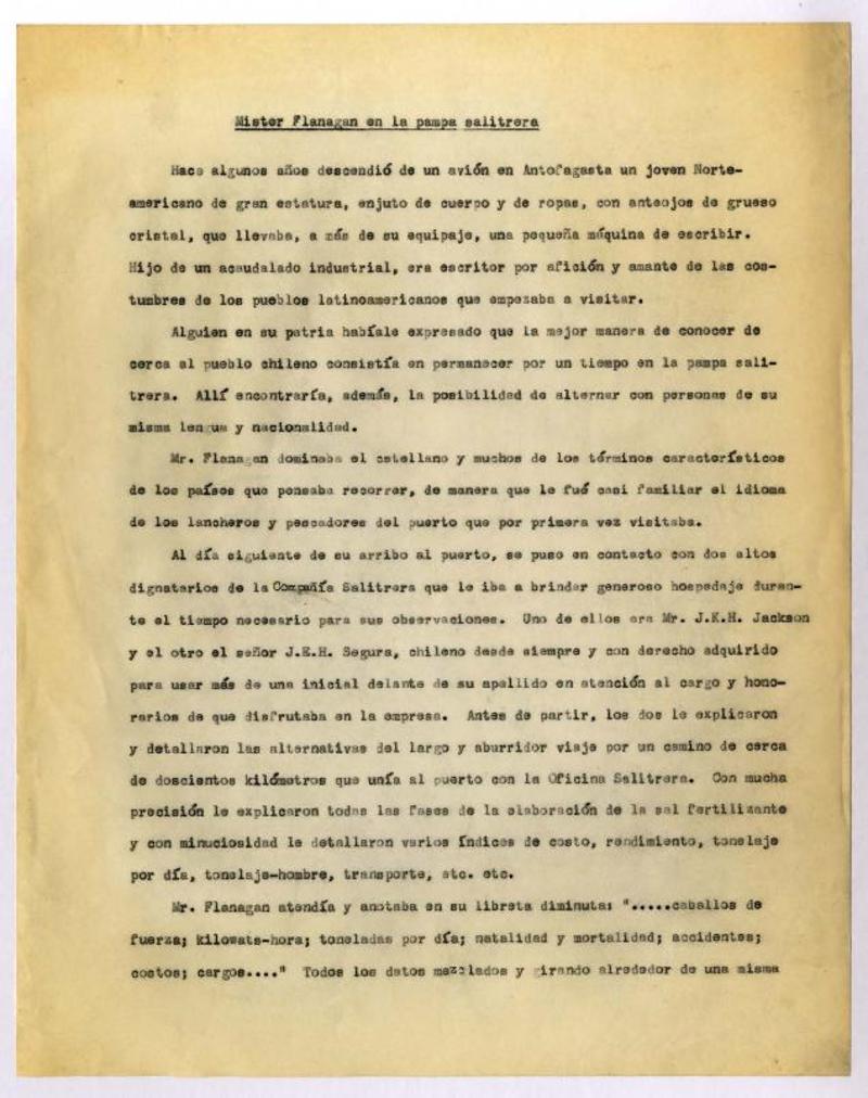 Mister Flanagan en la pampa salitrera [manuscrito] Nathanael Yáñez Silva.