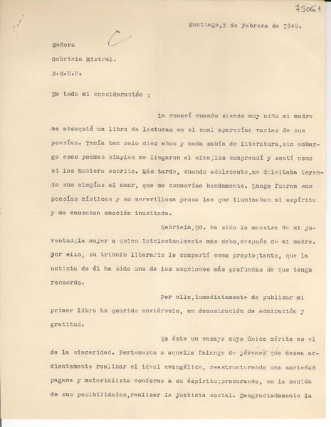 [Carta] 1948 feb. 5, Santiago [a] Gabriela Mistral, E.E.U.U. [manuscrito] Máximo Pacheco Gómez.