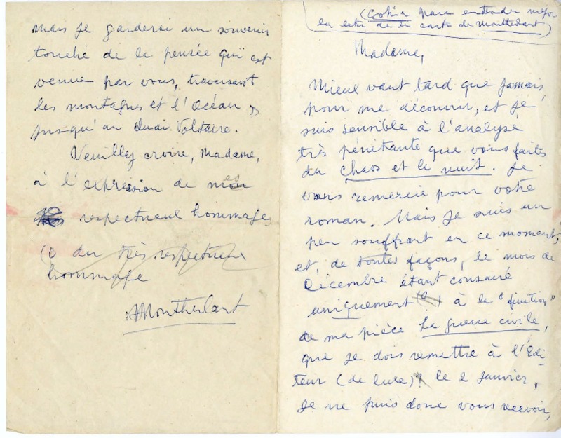 Montherlant,Henri de - Autoras chilenas - Correspondencia - Petit, Magdalena - Autores franceses - Manuscritos franceses