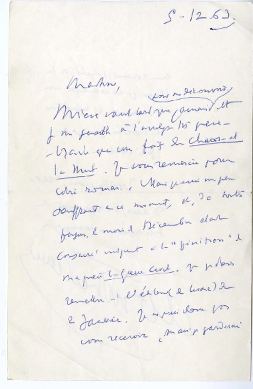 [Carta] 1963 diciembre 5, Paris, Francia [a] Magdalena Petit [manuscrito] Henri de Montherlant.