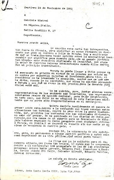 [Carta] 1951 nov. 26, Santiago, [Chile] [a] Gabriela Mistral, Nápoles, Italia [manuscrito] Tomás Lago.