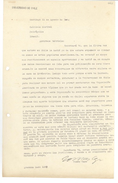 [Carta] 1942 ago. 11, Santiago, [Chile] [a] Gabriela Mistral, Petrópolis, Brasil [manuscrito] Tomás Lago.