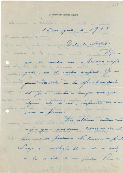 [Carta] 1943 ago. 15, Buenos Aires [a] Gabriela Mistral [manuscrito] Clementina Isabel Azlor.