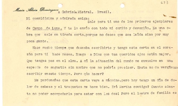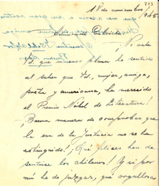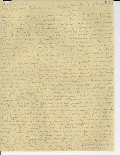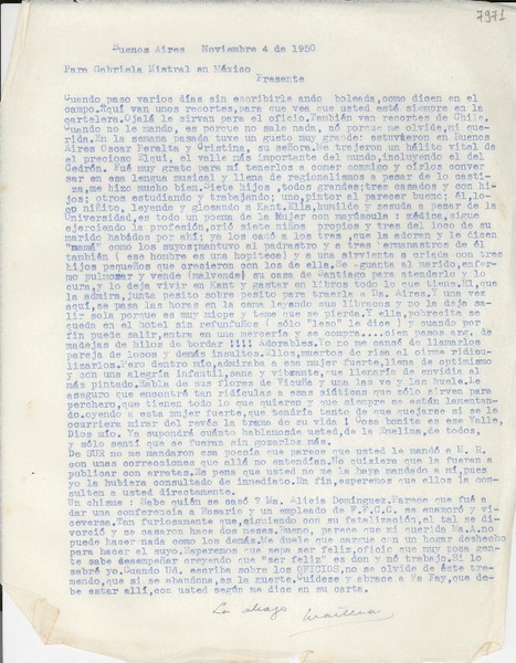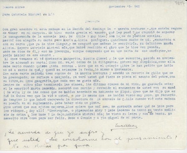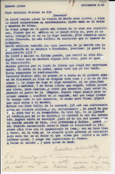 [Carta] 1943 nov, Buenos Aires [a] Gabriela Mistral, Brasil [manuscrito] María Alicia.